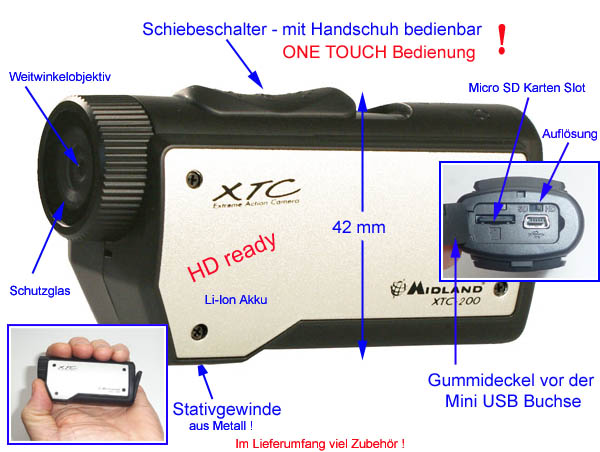 Verschiedene Kameras für den Biker - im Shop als: ALAN-CAM Z.B. wie hier die XTC-200, die Videos in HD Qualität macht und direkt als xxx.MP4 Dateien auf die Micro SD-Karte schreibt. Einfach mal wieder genial ! Es gibt sogar ein wasserdichtes Gehäuse dafür. Von Haus aus ist diese Kamera jedoch schon regengeschützt! Im Shop habt ihr diese 6 Kameras zur Auswahl. Auch eine mit GPS Streckenaufzeichnung ist dabei !