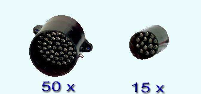 geringe Stromaufnahme. (660nm) GaAIAs 16000-23000mcd Farbe: rot LED-Gehäuse: farblos, klar Ub: 10VDC IF: 200mA(rot) 250mA (grün+gelb) D: 52mm Abstrahlwinkel: 40° Befestigung durch seitliche Flansche.