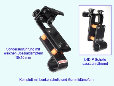 Hier mit der Lenkerschelle (4-Krallenklicksystem) und 4 Gummidämpfern. Im Shop als Artikel: Z100-4D-1630 zu finden. Sie können verschiedene Optionen wählen. (Sonnenblende, oder für KFZ- / Motorradcradle). Auch die Schelle 1569 kann verwendet werden, so wie hier.